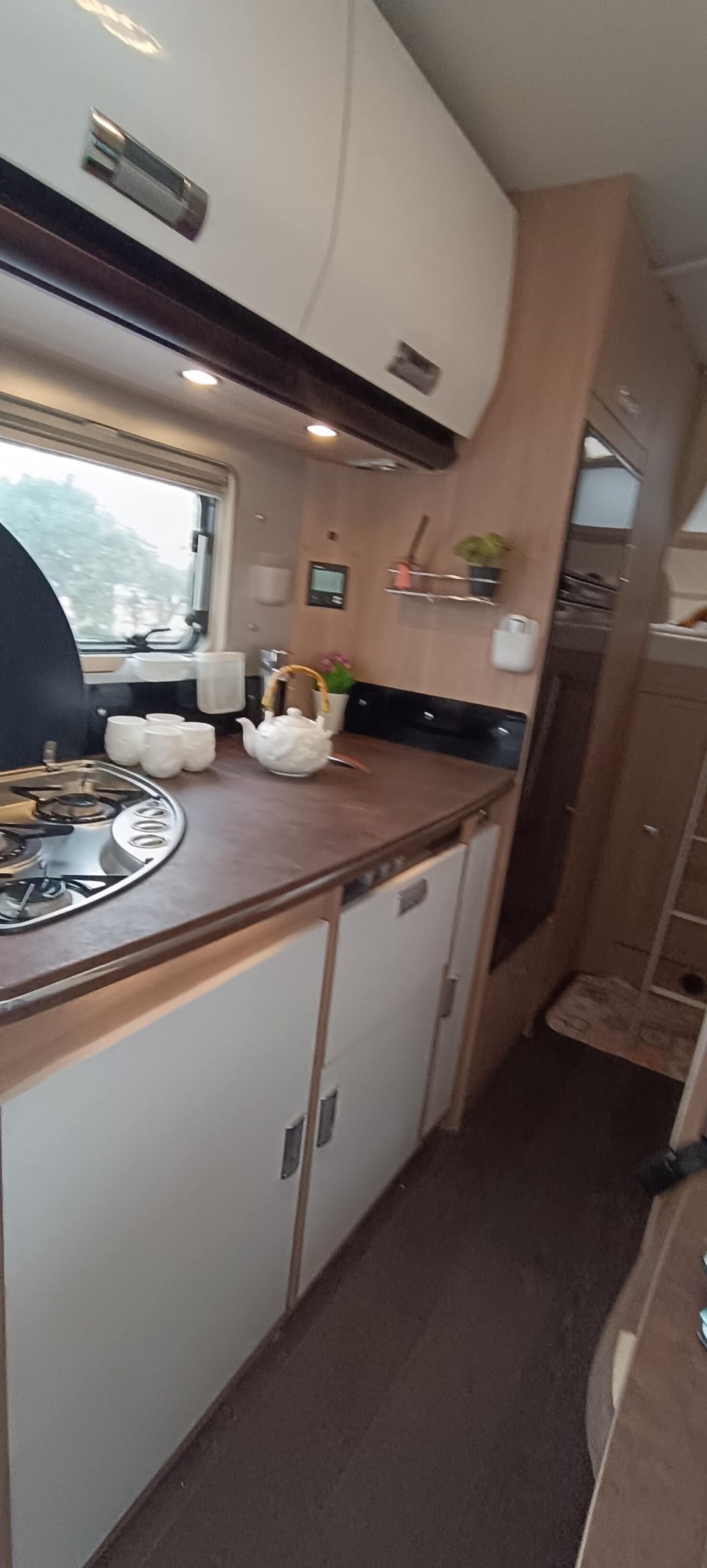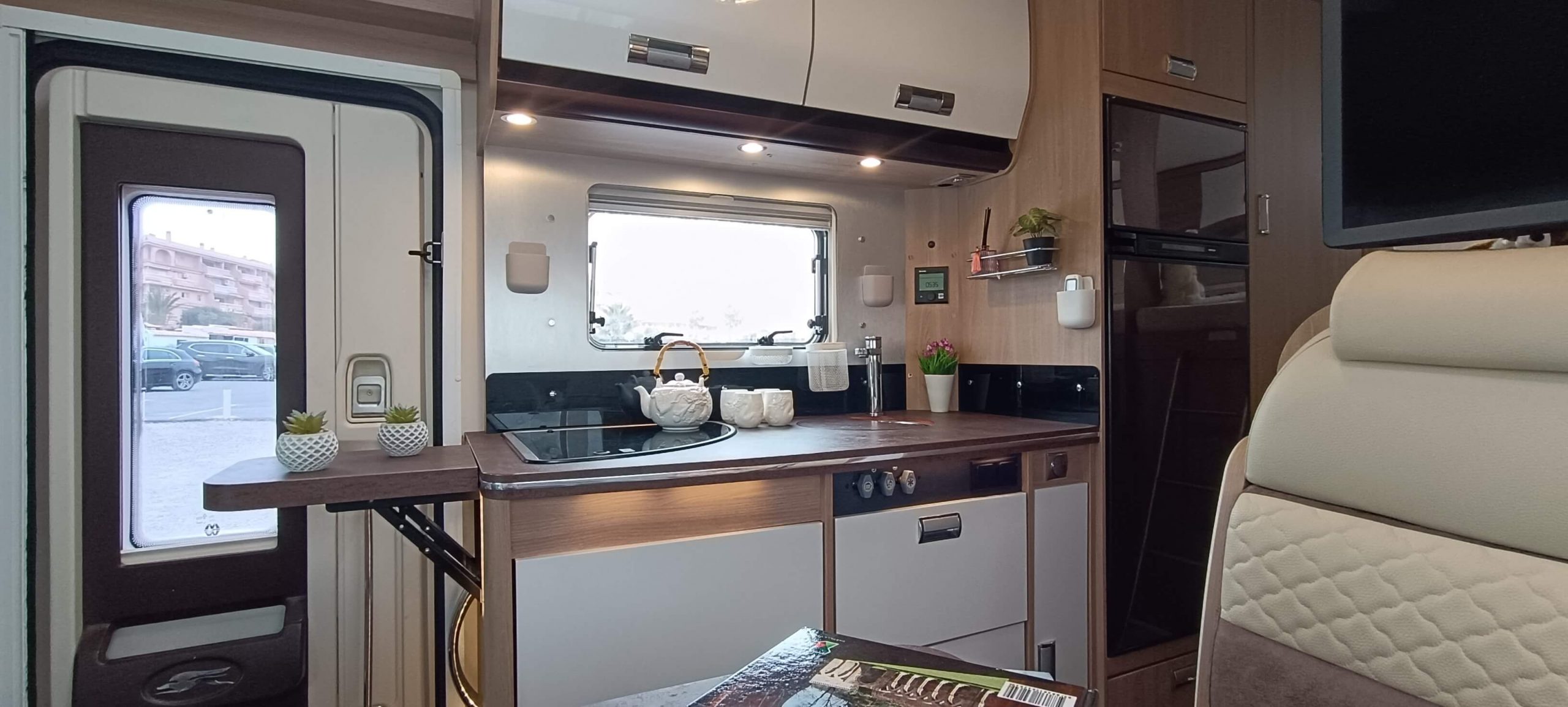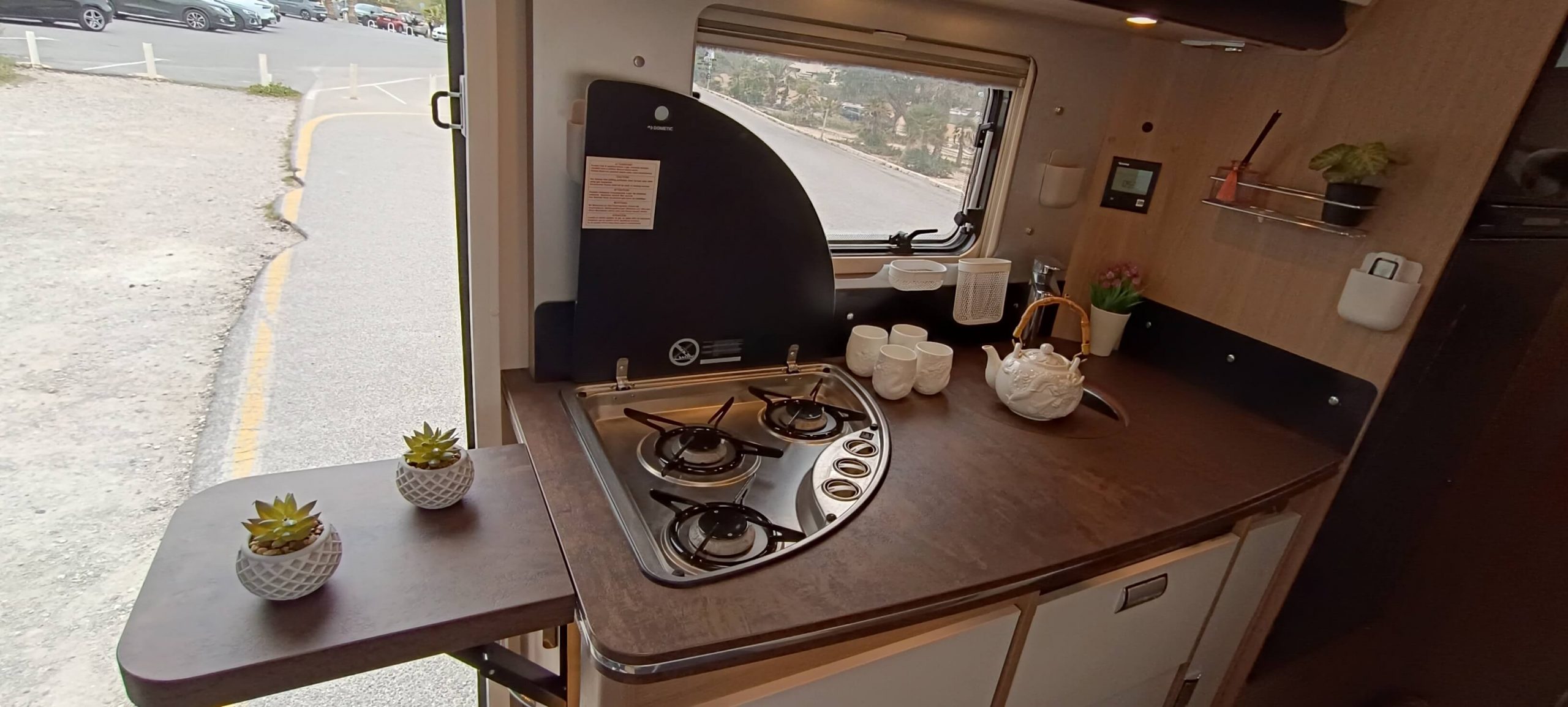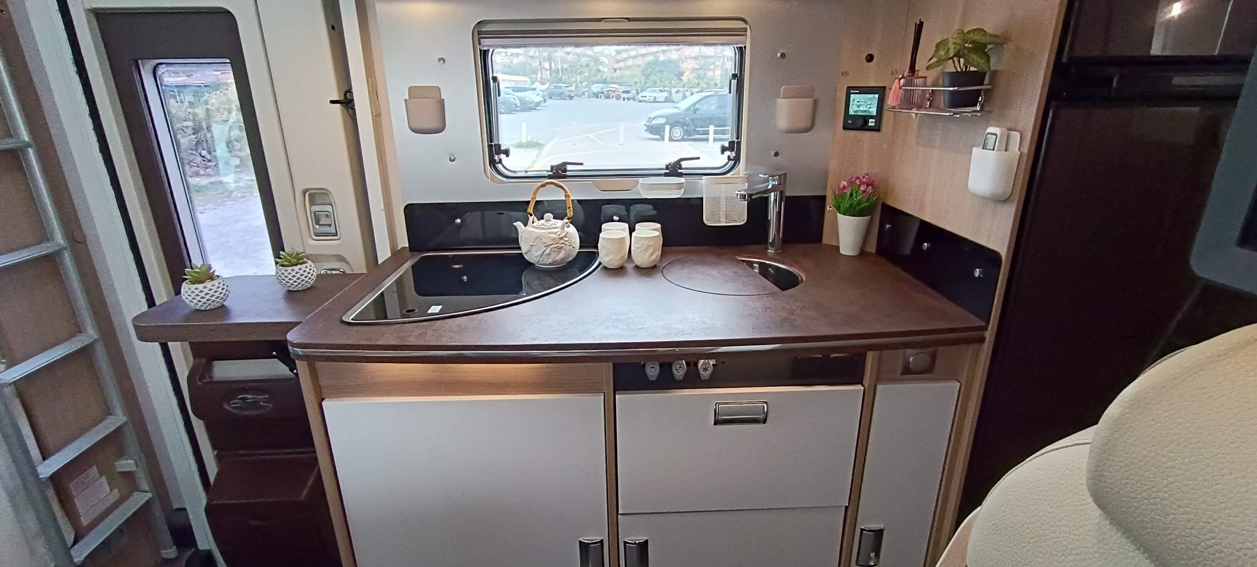La cocina completa cuenta con 3 fuegos, fregadero y una nevera GRANDE trivalente (gas, 12V, 220V) con congelador. Amplios armarios superiores e inferiores para almacenar todo lo necesario durante días.