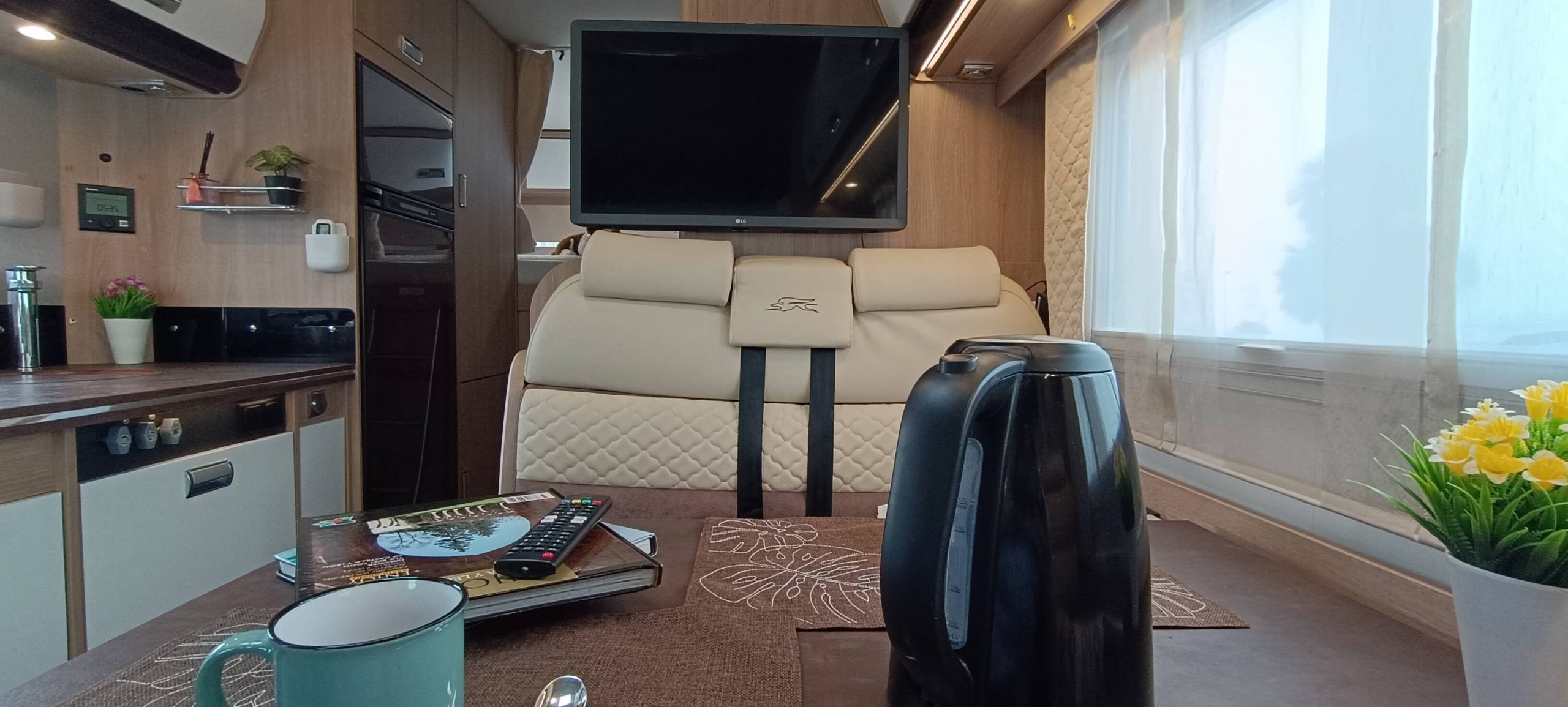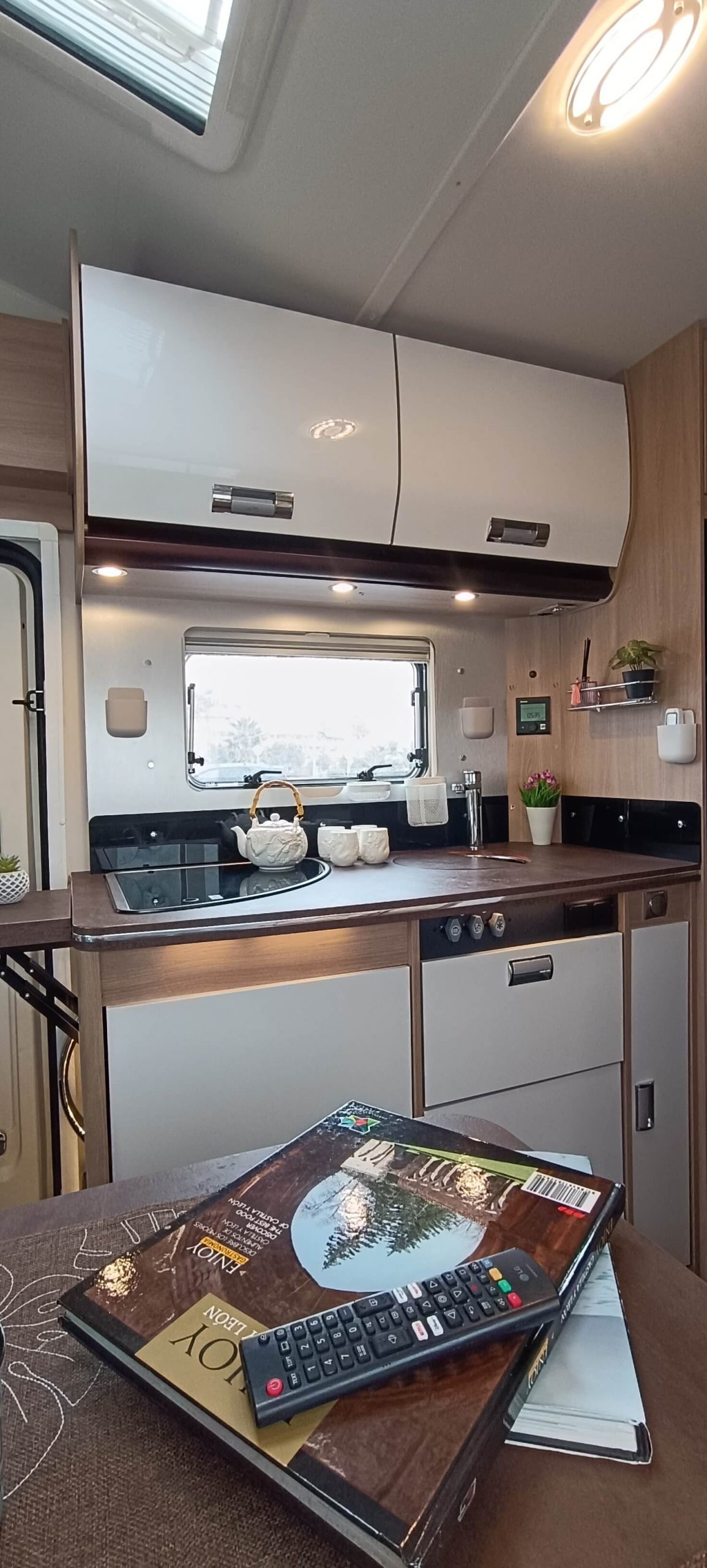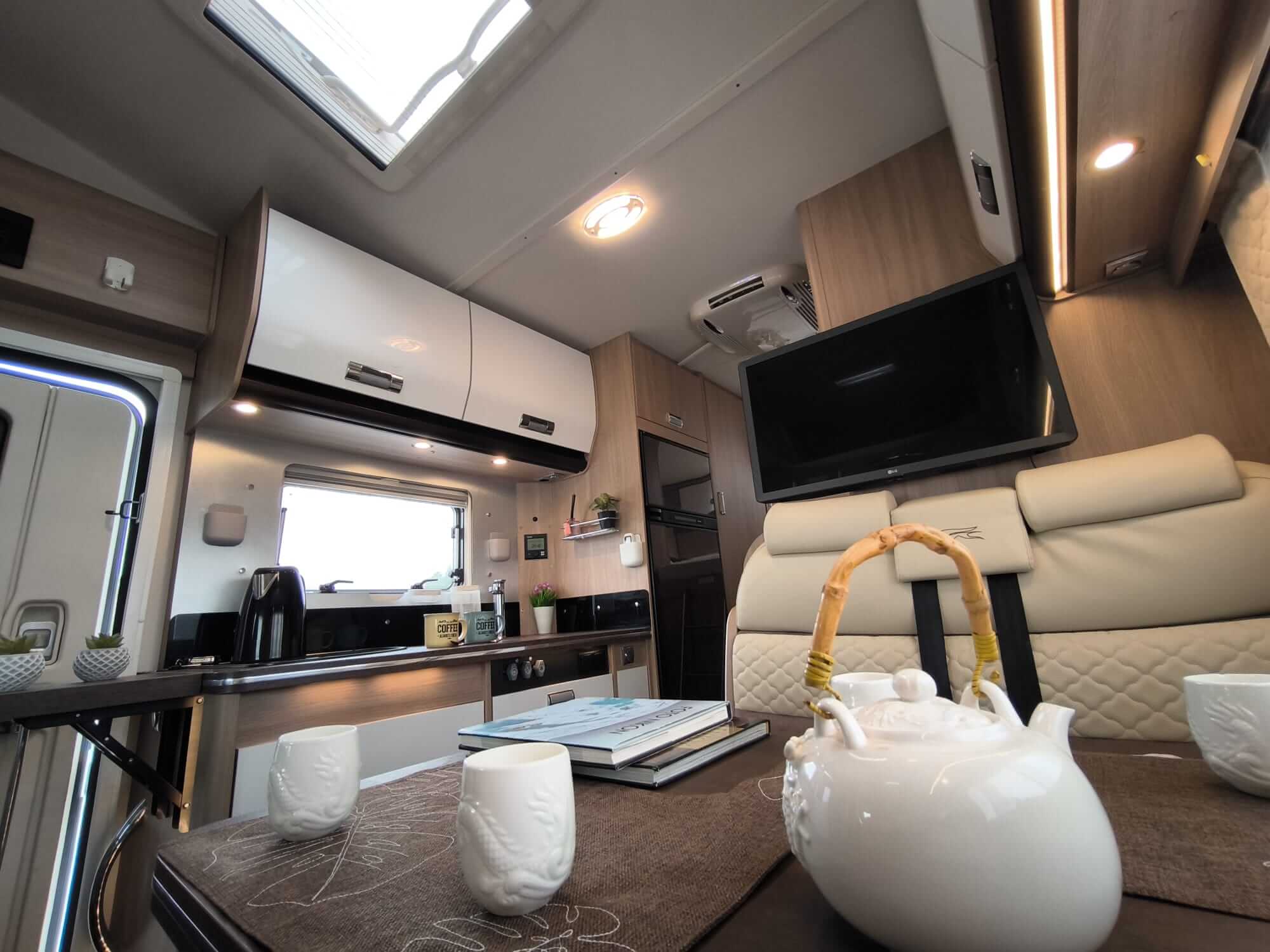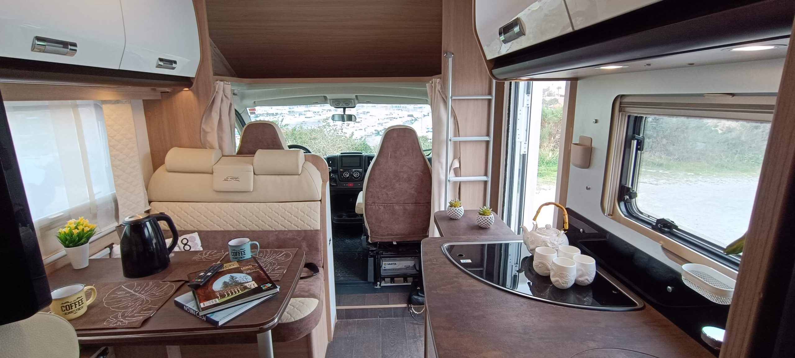 La cocina completa cuenta con 3 fuegos, fregadero y una nevera GRANDE trivalente (gas, 12V, 220V) con congelador. Amplios armarios superiores e inferiores para almacenar todo lo necesario durante días.
