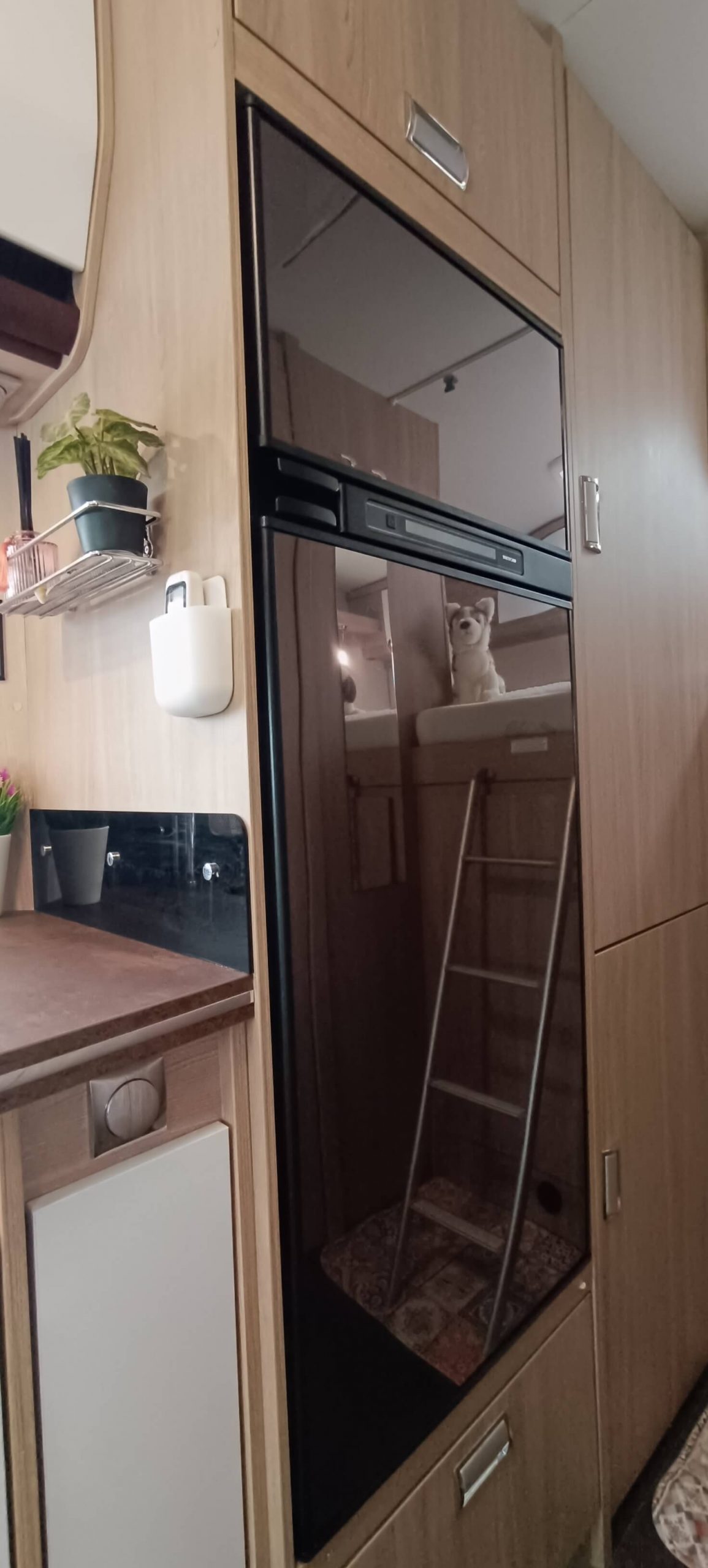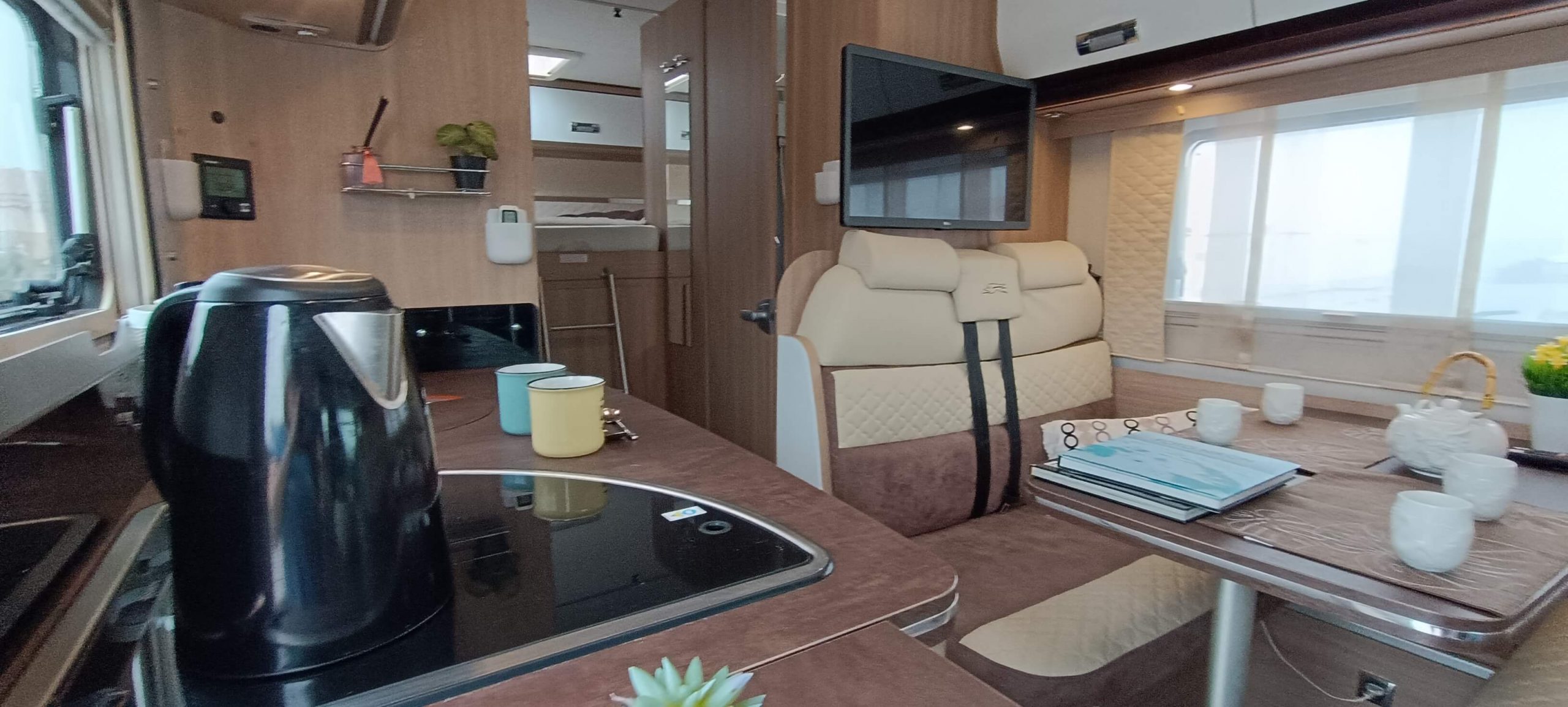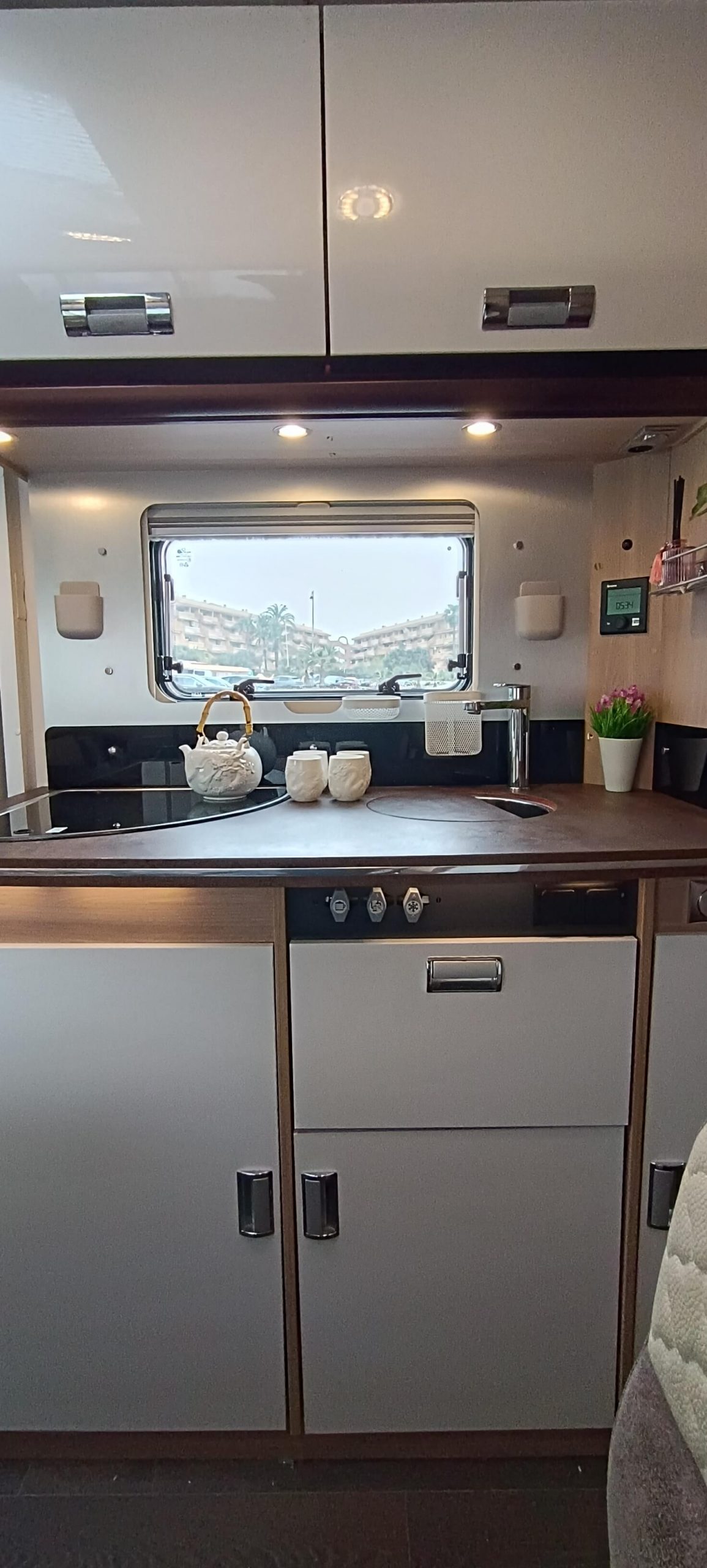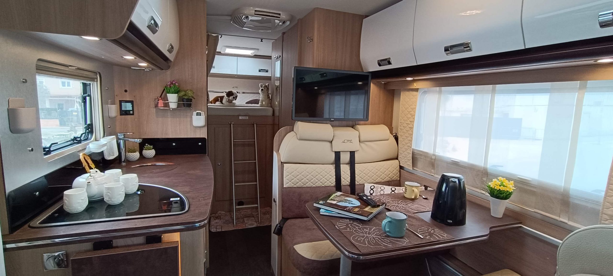 La cocina completa cuenta con 3 fuegos, fregadero y una nevera GRANDE trivalente (gas, 12V, 220V) con congelador. Amplios armarios superiores e inferiores para almacenar todo lo necesario durante días.