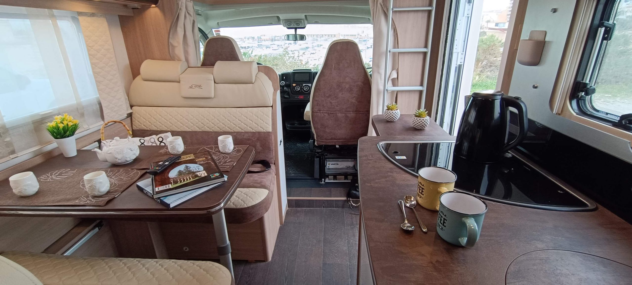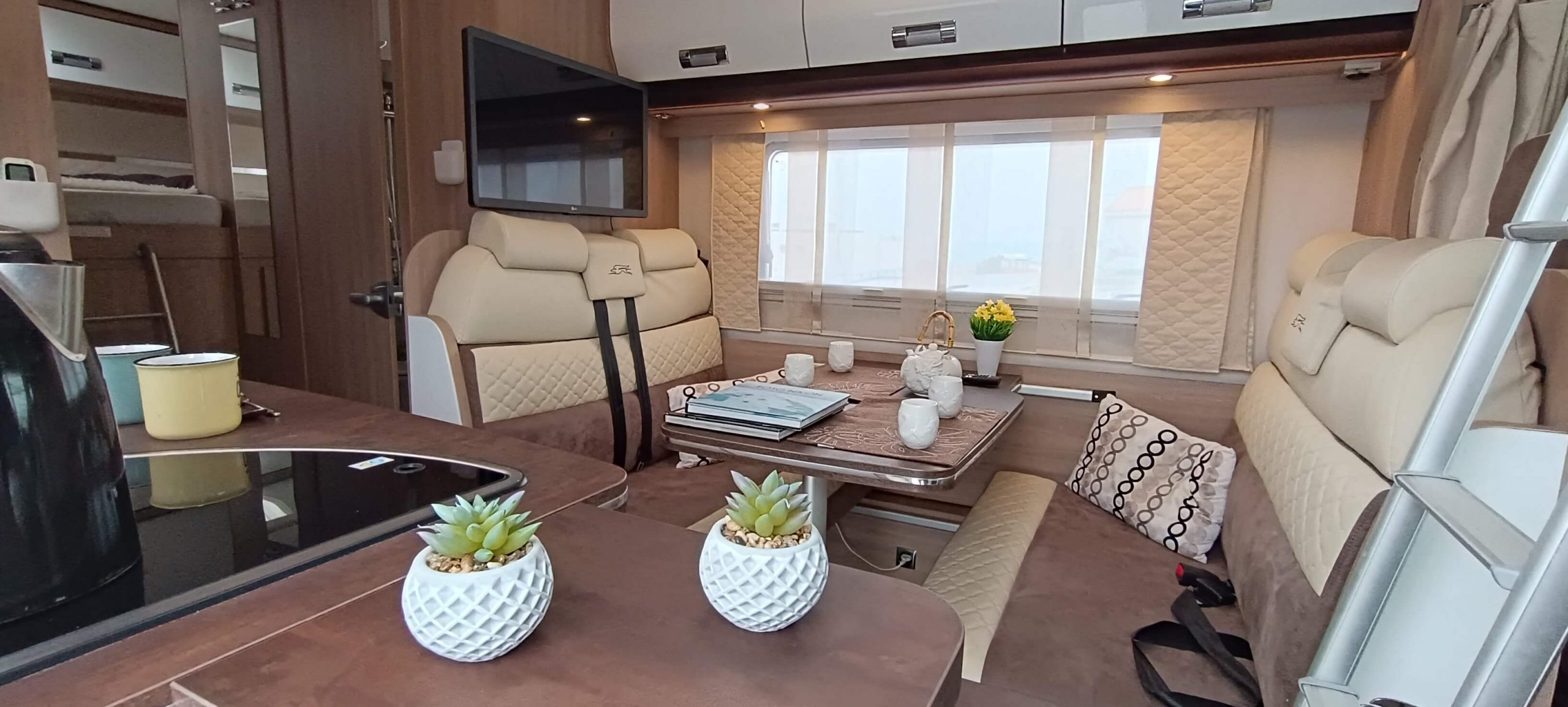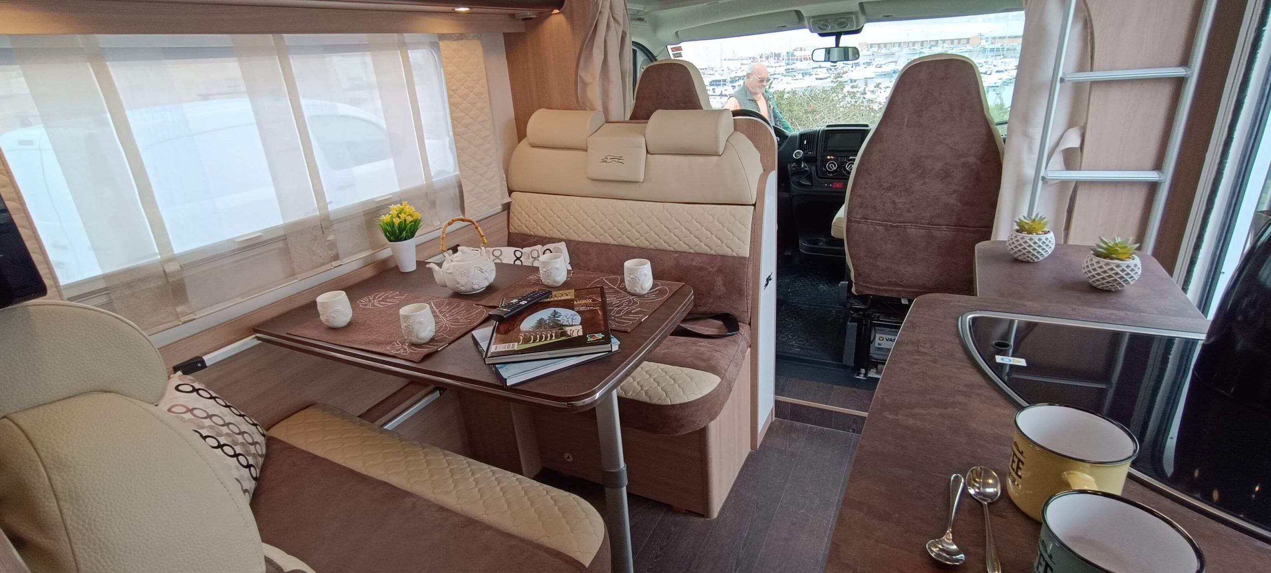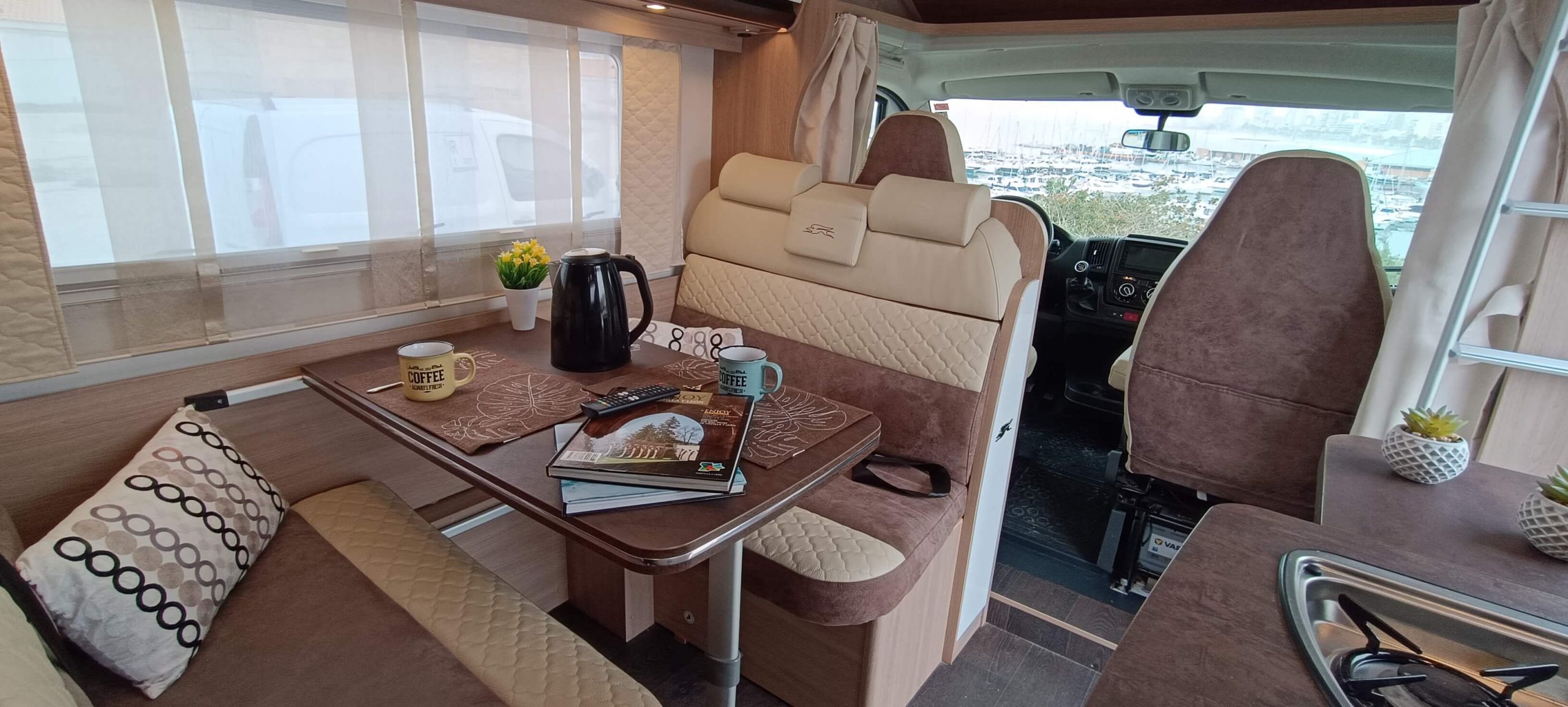 El corazón de la autocaravana. Disfruta de un salón enfrentado (face-to-face) con dos amplios sillones y mesa central. Los asientos están homologados para viajar, creando un espacio perfecto para comidas, tertulias o teletrabajo con vistas.