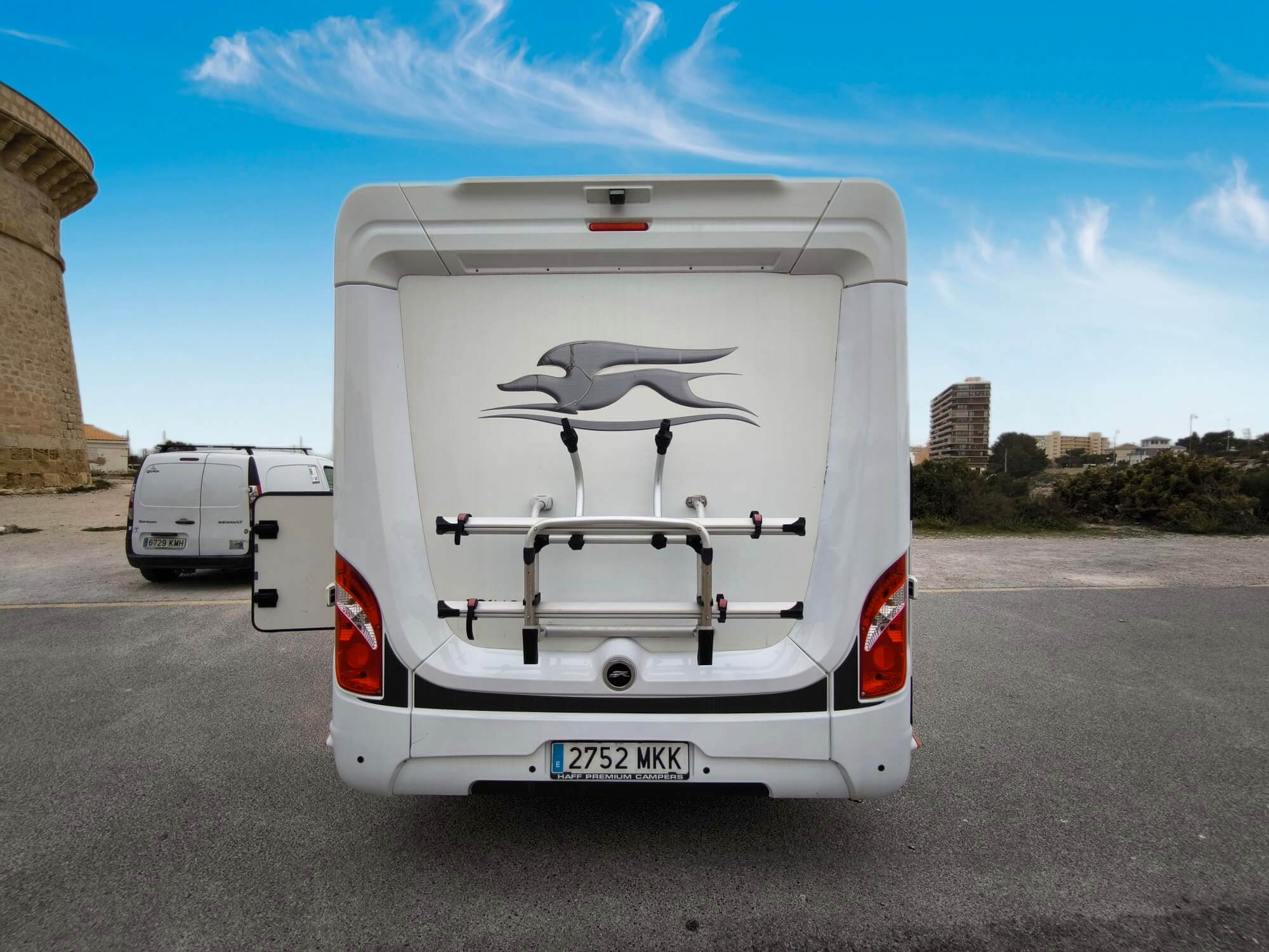 En el exterior también encontrarás un toldo enrollable para crear tu zona de sombra donde quieras, y un porta bicicletas incluido para tus rutas sobre dos ruedas. Cierres de seguridad extra en todas las puertas para viajar tranquilo.